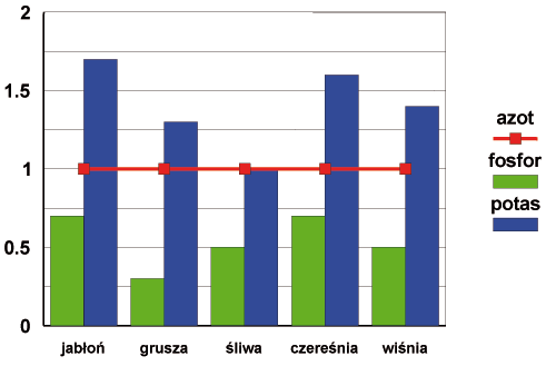 Istotną rolę w prawidłowym doborze składników wprowadzanych do gleby wraz z nawozami odgrywają także potrzeby pokarmowe poszczególnych gatunków sadowniczych, a zwłaszcza relacje pomiędzy azotem (N), fosforem (P2O5) i potasem (K2O). Podejmując decyzje o nawożeniu jesiennym lub wczesnowiosennym warto zapewne uwzględnić różnice pomiędzy gatunkami uprawianych drzew w sadzie dotyczącymi zapotrzebowania na podstawowe składniki pokarmowe (wykres).