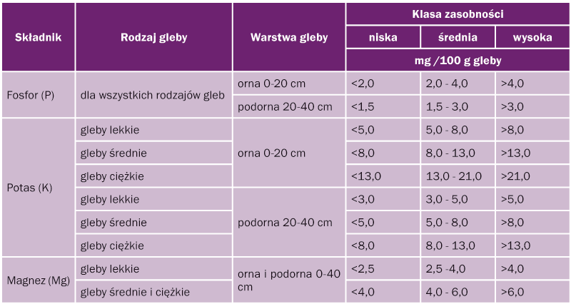 Aby mówić o rzetelnym nawożeniu sadów niezbędna jest przede wszystkim ocena zasobności gleby w składniki pokarmowe, której możemy dokonać poprzez wykonanie chemicznej analizy gleby i prawidłową interpretację jej wyników. Okres późnej jesieni jest doskonały do tego typu działań, bowiem wyniki analizy gleby pobranej w sadzie w tym czasie oddają rzeczywistą jej zasobność w składniki pokarmowe po całym okresie wegetacji. Ewentualne nawożenie gleby powinno być prowadzone na podstawie wyników analizy gleb oraz ich klasyfikacji pod względem zasobności w składniki pokarmowe (tabela 1).
