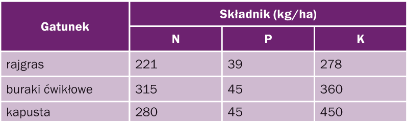 Planowane nawożenie gleby powinno również uwzględniać potrzeby pokarmowe uprawianych gatunków, w tym ilości składników, które wraz z plonem opuszczają pod koniec sezonu wegetacyjnego glebę w sadzie. Dla jabłoni ilości tych składników są zdecydowanie niższe w porównaniu do innych gatunków uprawnych (tabela 2).