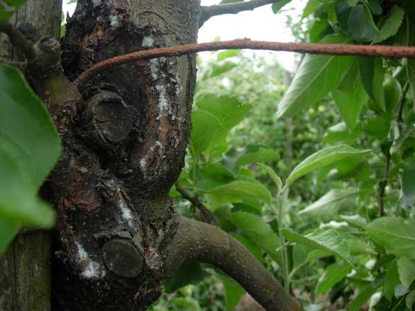 Szkodnikiem, który w niektóre lata występuje w dużym nasileniu jest bawełnica korówka (fot. 8) – skutek jej żerowania to spękania i rany na korze drzew, przez które następują infekcje przez patogeny kory i drewna, także słabsze zawiązanie pąków kwiatowych oraz zwiększenie wrażliwości drzew na przemarzanie. W ciągu sezonu wegetacyjnego występuje nawet 10-12 pokoleń, populacja prawie zanika w lipcu i sierpniu (w tym okresie naturalni wrogowie – skorki, biedronki, osiec – zwiększają swoją liczebność i mogą zniszczyć populację szkodnika) i ponownie nasila się jesienią, we wrześniu oraz październiku. Zabieg może być więc konieczny w lipcu lub na początku sierpnia (jeśli stwierdzi się 2 drzewa z koloniami żywych mszyc w próbie 50 drzew) albo dopiero w 2. połowie września lub w październiku, po zbiorach, w ciepłe, słoneczne dni. Polecane preparaty to Pirimor 500 WG lub Actara 25 WG, które powinno się stosować w większej dawce cieczy – minimum 750 l, a lepiej 1000 l, ze zwilżaczem, opryskując także pnie w części przyziemnej (należy zwracać uwagę na dobre pokrycie dolnych partii korony, pni i podkładki, zabezpieczać pękające pnie i rany po cięciu). Lepiej nie używać pyretroidów. Zabieg należy wykonać najlepiej przy temperaturze nie niższej niż 18°C. Wskazane jest również, aby przez kilka kolejnych dni było ciepło w godzinach popołudniowych (12-18°C). Na bawełnicę czasami trzeba wykonać w sezonie nawet 3-4 zabiegi co 10 dni. Pirimor ma dobre działanie, ale krótkie, dlatego należałoby go stosować wielokrotnie, ale jest on selektywny w stosunku dla fauny pożytecznej (m. in. ośca i skorków).