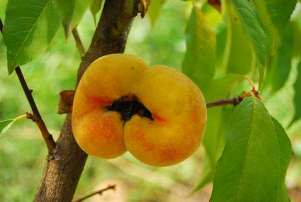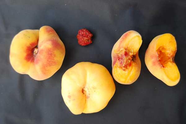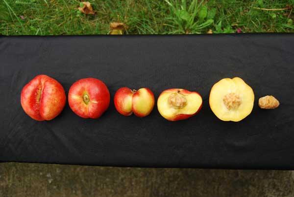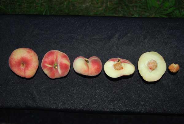 ‘Saturn’ jest najbardziej znaną polskim sadownikom odmianą o płaskich owocach. Wyhodowano ją w latach 60. ubiegłego wieku w USA (New Jersey Agricultural Experimental Station). Charakteryzuje się atrakcyjnymi owocami o kremowozielonej barwie skórki, którą w ponad 70% pokrywa jasnoczerwony rumieniec (fot. 1). W zależności od stopnia przerzedzenia zawiązków owoce osiągają masę 60-80 g. Miąższ jest kremowobiały, soczysty, słodki, niezbyt zwięzły, smaczny, dość dobrze odchodzący od pestki (fot. 2). Pestka mała, spłaszczona, ma masę około 2,1 g. Udział pestki w ogólnej masie owocu jest bardzo niski i nie przekracza 3-4%. W 2008 roku owoce odmiany ‘Saturn’ dojrzałość zbiorczą osiągnęły w końcu lipca. Powinno się je zbierać kilka dni przed pełną dojrzałością, gdyż po zbiorze szybko miękną i łatwo się odgniatają. Zbiór owoców tej odmiany należy przeprowadzać umiejętnie. Jeśli czynność tą wykonuje się niewłaściwie, to przy ich odrywaniu od pędów często dochodzi do uszkodzenia skórki wokół szypułki i takie owoce mają niższą wartość handlową, szybko gniją. Owoce ‘Saturna’ są doskonałe zarówno w stanie świeżym, jak i nadają się na przetwory (fot. 3).
