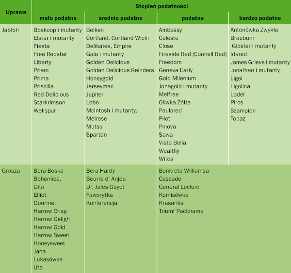 W integrowanej ochronie przed zarazą ogniową bardzo ważną rolę odgrywa dobór odmiany (tab.). Istotny jest także wybór odpowiedniego miejsca pod sad, z uwzględnieniem rodzaju gleby, jej zasobności i odczyn, a także poziomu wód gruntowych. Niezbędne jest także odpowiednie nawożenie i zabiegi agrotechniczne. Nawożenie mineralne powinno być tak prowadzone, aby uniknąć przedłużonego wzrostu wegetatywnego drzew i utrzymać właściwy bilans między poszczególnym składnikami odżywczymi. Nie można dopuścić do nadmiaru azotu, który poprzez stymulowanie wzrostu zwiększa podatność na chorobę. Odczyn gleby powinien być lekko kwaśny. W sadach zagrożonych należy zrezygnować z nawadniania typu deszczownianego.