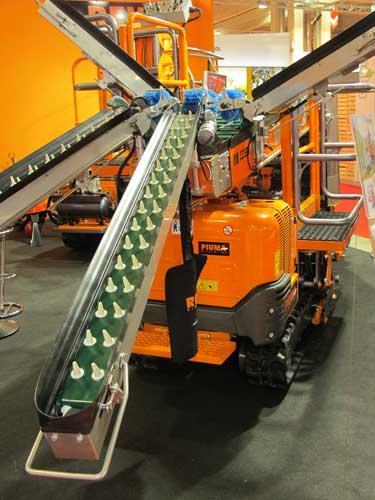 Wiele z tych maszyn przygotowano z myślą o pracy w trudnych terenach, np. w sadach położonych na skłonach. W takich warunkach dobrym rozwiązaniem może być zastąpienie kół samobieżnego kombajnu gąsienicami (fot. 2). Polscy sadownicy także przyglądali się temu rozwiązaniu, ale głównie z myślą o możliwości wykorzystania go do prac przy cięciu drzew wczesną wiosną, gdy w sadach zalega jeszcze śnieg lub podczas zbiorów w okresach deszczu, gdy murawa jest nasączona wodą.