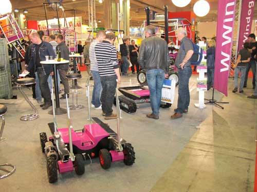 Ciekawostką były niewielkie „wózki-platformy” zasilane elektrycznie i zdalnie sterowane pilotem (fot. 3 a-c). Można je wykorzystywać do podstawiania i odstawiania skrzyniopalet podczas zbiorów owoców z platform.