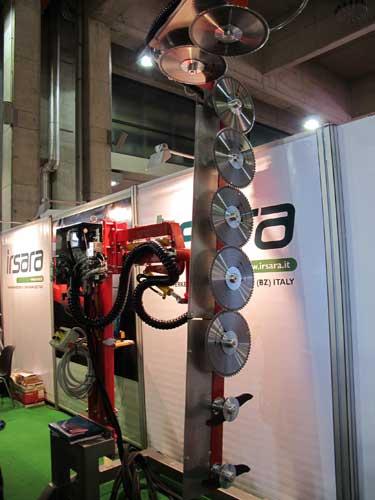 Zainteresowanie budziła zaczepiana z przodu ciągnika instalacja z obrotowymi tarczami tnącymi, służąca do mechanicznego cięcia drzew w sadzie (fot. 5). Prezentowany model FL800P waży około 340 kg i może ciąć w pionie na maksymalną wysokość 4,5 m, a poziomie (ponad koroną) na szerokość 3,7 m. Według przedstawicieli włoskiej firmy BMV, która przywiozła to urządzenie do Bolzano, można nim ciąć zarówno drzewa w czasie spoczynku, jak i po rozwoju liści. Do cięcia pędów o średnicy do 2-3 cm służą obrotowe noże, a konarów o średnicy 6-8 cm – obrotowe tarcze. Najlepiej wykonać pierwsze cięcie zimą, a kolejne – korygujące – na przełomie kwietnia i maja. Opisywany model kosztuje w przeliczeniu około 60 tys. złotych.
