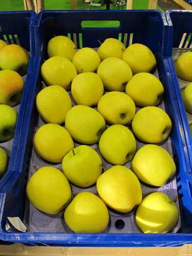 W tym roku sporo miejsca poświęcono jabłkom o żółtej i zielonej skórce. Wśród nich znalazły się między innymi pochodzące z Czech, odporne na parcha jabłoni ‘Opal’ (‘Golden Delicious’ x ‘Topaz’; fot. 7) i ‘Luna’ (‘Golden Delicious’ x ‘Topaz’), japońska odmiana ‘Shinano Gold’ (fot. 8; ‘Golden Delicious’ x ‘Senshu’) o owocach bardzo odpornych na transport (trudno się obijają) czy pochodząca z Nowej Zelandii odmiana PremA153 (fot. 9; ‘Gala’ x ‘Braeburn). Z Francji wywodzi się odmiana Dalitron Altess® (fot. 10; ‘Pilot’ x ‘Golden Delicious’), której zaletą ma być fakt, że jej owoce nie żółkną podczas przechowywania. Z tego powodu jabłka te trzeba jednak zbierać z drzew w odpowiedniej fazie dojrzałości.