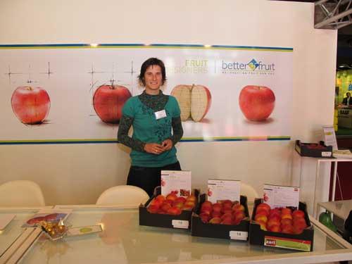 Tłumy zwiedzających przyciągało stoisko włoskiej szkółki Gruber Genetti, która przywiozła na targi odmianę jabłoni Redlove® – o owocach z czerwonym miąższem. Jej jabłka są okrągłe, średniej wielkości i mają czerwoną skórkę (fot. 11 a,11b). Miąższ jest również czerwony (czasem z jasnymi pierścieniami), kruchy i soczysty, lekko kwaśny. Ponieważ jego smak nie jest do końca zgodny z wymaganiami konsumentów jabłek, owoce te promuje się na razie jako jabłka do gotowania i pieczenia (miąższ nie zmienia barwy podczas obróbki termicznej) oraz jako dodatek do soków, którym nadaje niespotykaną barwę. Odmiana Redlove® jest odporna na parcha jabłoni.