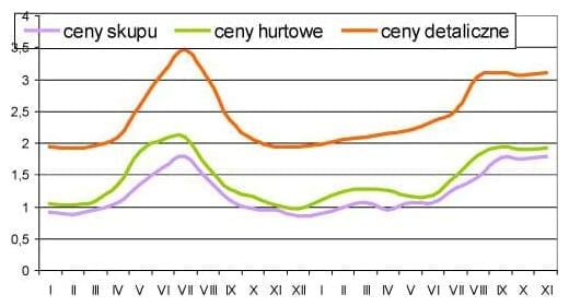 Głęboki spadek zbiorów spowodował zwiększenie cen jabłek we wszystkich ogniwach łańcucha marketingowego (rys. 1). Najbardziej, bo czterokrotnie (z 0,17-0,18 zł/kg do 0,65-0,70 zł/kg) zwiększyły się ceny skupu jabłek przemysłowych. Przeciętne ceny skupu jabłek deserowych w okresie wrzesień-listopad (notowania w spółdzielniach ogrodniczych) zwiększyły się w relacji do analogicznego okresu z 2009 r. o ok. 80%. Ceny hurtowe wzrosły w tym okresie o ok. 70%, a ceny detaliczne o ok. 45%. Ceny skupu jabłek kierowanych na eksport zwiększyły się prawie dwukrotnie. We wrześniu i październiku ceny w eksporcie jabłek były wyższe niż w tych samych miesiącach roku poprzedniego o ok. 70% i wyniosły 0,35 euro/kg (1,4 zł/kg). Najbardziej zwiększyły się ceny skupu, hurtowe, detaliczne i eksportowe owoców odmian: ‘Šampion’, ‘Jonagold’ i ‘Gala’.
