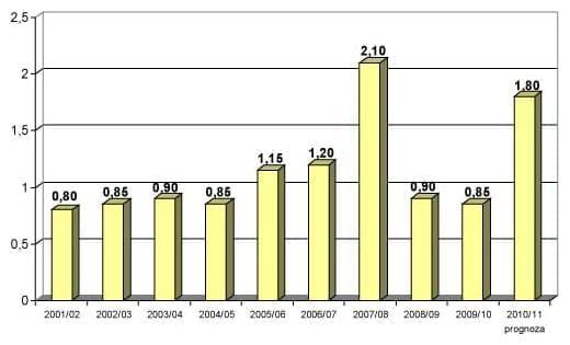 Według nieostatecznych danych, zbiory jabłek w Polsce wyniosły w 2010 r. ok. 1,8-1,9 mln ton i były niższe niż w roku poprzednim o 28-32%. W obecnej dekadzie niższe były zbiory jabłek jedynie w 2007 r. Na spadku produkcji w Polsce (i w całej Europie) zaważyły niekorzystne warunki meteorologiczne w całym okresie wegetacji.