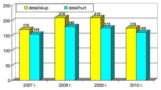 W bieżącym sezonie zmniejszą się w relacji do 2009/10 r. marże handlowe (rys. 3) na rynku jabłek, a także większości pozostałych owoców i warzyw świeżych. W październiku 2010 r. ceny detaliczne były wyższe od cen skupu i cen hurtowych jabłek odpowiednio o 75% i 60%, wobec 110% i 75% w październiku roku poprzedniego. Oznacza to mniejszy wzrost cen detalicznych niż cen skupu i hurtowych jabłek. Mniejsze marże pobierane są przez punkty sprzedaży detalicznej w latach niskich zbiorów i wysokich cen owoców oraz warzyw w celu ograniczenia skutków wzrostu cen skupu dla poziomu sprzedaży w sklepach detalicznych.