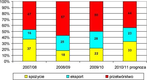 W wyniku mniejszych zbiorów w krajach odbiorcach polskich jabłek – przede wszystkim w Rosji, zapotrzebowanie na te owoce na rynkach zagranicznych może być większe niż w 2009/10 r. Jednakże eksport w bieżącym sezonie może obniżyć się znacznie bardziej niż spożycie i zbiory krajowe z powodu konkurencji wewnętrznej rynku jabłek deserowych (rys. 4). Różnice cen jabłek kierowanych na eksport i możliwych do uzyskania na rynku krajowym będą większe niż w 2009/10 r. Przewiduje się, że w bieżącym sezonie eksport stanowił będzie ok. 40% podaży jabłek deserowych, wobec ponad 50% w sezonie 2009/10. W łącznym rozdysponowaniu podaży jabłek w Polsce udział eksportu wyniesie 24-25%, spożycia krajowego 30-32%, a przetwórstwa 44-45%, wobec odpowiednio 28, 22 i 50% w sezonie 2009/10.