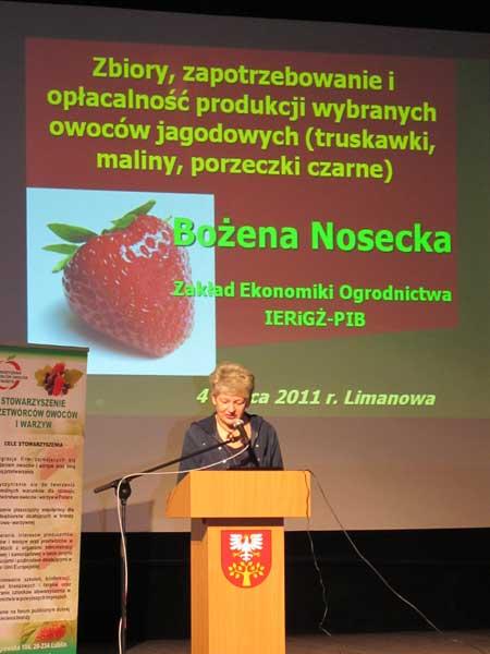 Dr Bożena Nosecka (fot. 3) z Instytutu Ekonomiki Rolnictwa i Gospodarki Żywnościowej przedstawiła prognozy dla rynku owoców jagodowych. W najbliższych latach utrzyma się zapotrzebowanie krajów UE na truskawki mrożone. Naszej pozycji zagraża jednak konkurencja tanich owoców z Chin, Maroka oraz Egiptu. Żeby ją utrzymać trzeba poprawić jakość surowca i wydajność produkcji, co bez wsparcia zakładów przetwórczych raczej nie będzie możliwe. Należałoby przywrócić bowiem uprawę dobrych odmian, plantacji zakładanych z kwalifikowanego materiału oraz zintensyfikować produkcję tak, aby zbierać 15 ton truskawek z hektara. W przypadku truskawek deserowych możliwy jest jedynie wzrost zapotrzebowania na owoce produkowane poza sezonem. Gdybyśmy mogli skoncentrować podaż, takie truskawki można by także eksportować.