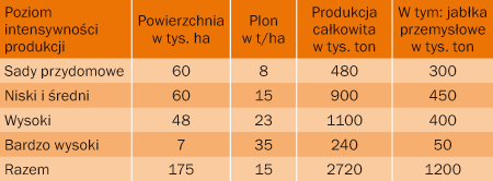 Ze 175 tys. ha krajowych sadów jabłoniowych tylko 7 tys. ha to sady na bardzo wysokim poziomie intensywności produkcji (tab. 1).