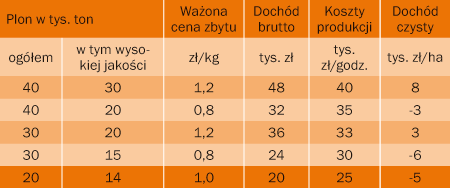 Zdaniem profesora Makosza, tylko około 35% jabłek deserowych zbieranych corocznie w Polsce to owoce wysokiej jakości. W krajach Europy Zachodniej jest to 70%. Różnice musimy szybko nadrobić, jeżeli chcemy pozostać konkurencyjni. O tym czy opłaca się produkować jabłka wysokiej jakości najlepiej przekonują wyliczenia przedstawione przez prof. Makosza (tab. 2). Jeżeli nie poprawimy jakości jabłek, może jeszcze wzrosnąć udział w produkcji owoców przemysłowych, co spowoduje, że ich cena obniży się. Przy stosunkowo wysokim plonie (40 t/ha), ale 50% udziale jabłek niskiej jakości produkcja będzie nieopłacalna, głównie ze względy na ceny niższe nawet o połowę. Podobnie może być przy plonie 30 t/ha, a przy 20 t/ha – nieopłacalna będzie nawet produkcja jabłek wysokiej jakości.