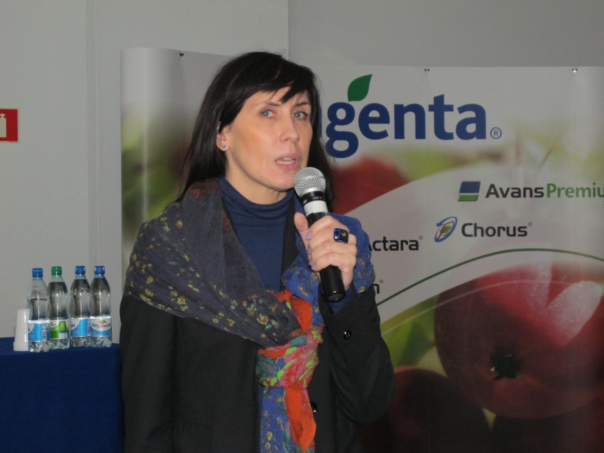 Jakość owoców jest wypadkową wielu czynników. Podczas sesji wykładowej duży nacisk kładziono na zależność od stanu fitosanitarnego roślin. Dr Beata Meszka (fot. 7) z Instytutu Ogrodnictwa w Skierniewicach, specjalizująca się w ochronie roślin sadowniczych przed chorobami, udzielała wskazówek na nadchodzący sezon. Jej zdaniem źródło większości chorób, w tym parcha jabłoni, będzie duże. Jest to wynikiem, trudnej sytuacji w ochronie spowodowanej zeszłorocznymi warunkami pogodowymi uniemożliwiającymi skuteczną walkę, a także rezygnacją z wykonywania zabiegów, czego przyczyną często były względy finansowe. Wśród wielu rad doktor Meszki, znalazły się i takie, by nie nadużywać środków należących do tych samych grup chemicznych i ograniczyć ich stosowanie do najwyżej 2 lub 3 zabiegów w sezonie. Efektem nieprzestrzegania tych zaleceń może być bowiem uodpornienie się agrofagów. Rada ta dotyczy wszystkich preparatów, zarówno kontaktowych, jak i układowych, których wg prelegentki należy użyć dopiero w warunkach wskazujących, że doszło do infekcji. Do tej grupy środków należy, m.in. triazolowy fungicyd Score 250 EC, który w ofercie głównego partnera targów – firmy Syngenta, znajduje się już od 20 lat. Jak informowała dr Meszka, to że środek jest wciąż niezmiennie popularny wśród sadowników i skuteczny, wynika z przestrzegania powyższych zaleceń oraz uwzględnienia przez praktyków rad, aby środki o specyficznym, jak chociażby triazole (IBE), mechanizmie działania stosować łącznie z fungicydami zachowującymi się inaczej, np. kontaktowymi (powierzchniowymi). Synergizm dwóch fungicydów skutkuje wydłużeniem i poprawą działania każdego z nich.