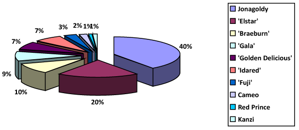 Struktura upraw w rejonie Jeziora Bodeńskiego przedstawia się następująco: 3300 ha zajmują ziarnkowe rośliny sadownicze, 250 ha – śliwy, 150 ha – czereśnie, 370 ha – truskawki i 100 ha – pozostałe rośliny jagodowe. Wśród odmian jabłoni dominują: Jonagoldy – 40%, ‘Elstar’ (Elshof) – 20%, ‘Braeburn’(Maririred) -10%, ‘Gala’ (Brookfield i Schniga) – 9%, ‘Golden Delicious’ – 7%, ‘Fuji’ (Fubrax) – 3%, Kanzi® – 1% (wykres). W nasadzeniach jabłoni coraz większą powierzchnię zaczynają stanowić odmiany, za których owoce można uzyskać najwyższe ceny – Kanzi® (0,50 euro/kg), Kiku® (0,39 euro/kg), Fubrax® (lepiej wybarwiający się mutant Kiku®) i Red Prince. Dla porównania, za jabłka odmiany ‘Golden Delicious’ sadownicy znad Jeziora Bodeńskiego uzyskują zaledwie ok. 0,17 euro/kg. ‘Gala’ jest wciąż uznawana za bardzo dobrą odmianę i jest z powodzeniem uprawiana w rejonie Jeziora Bodeńskiego, ale powierzchnia jej uprawy nie wzrasta ze względu na problemy z rakiem bakteryjnym oraz dlatego, że nie można zmusić drzew do wysokich plonów – najwyższe osiągają poziom ok. 40 ton z ha. Odmiana Cameo® nie do końca spełniła oczekiwania sadowników, gdyż – podobnie jak u ‘Glostera’ – jej jabłka mają tendencję do gnicia gniazda nasiennego (efekt infekcji w czasie kwitnienia grzybem Alternaria alternata).