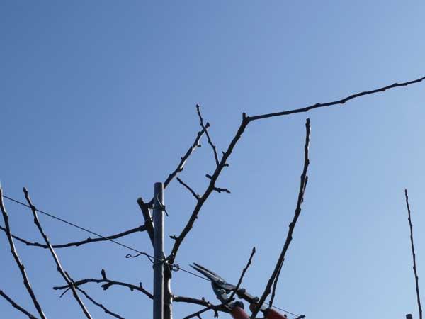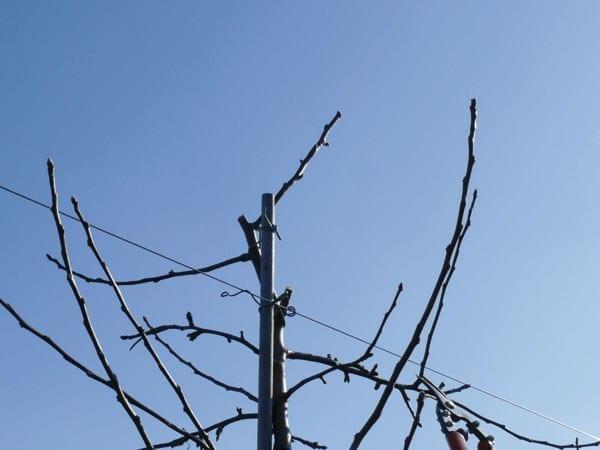 Tym razem cięcie należy rozpocząć od góry drzewa. Podobnie jak w pierwszym roku, przewodnik przycina się na wysokości 40-50 cm od najwyżej pozostawionego pędu bocznego