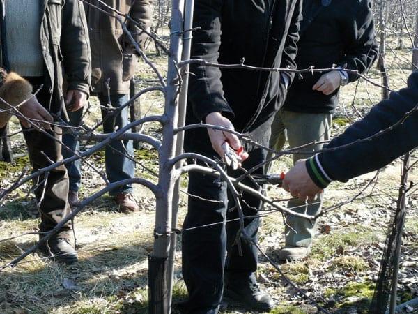 Gdyby sadownik sam wykonywał cięcie, miałby powyższe aspekty na uwadze. Niestety w praktyce, drzewa często tną grupy pracowników najemnych, którzy zazwyczaj nie przywiązują uwagi do sposobu cięcia, zaleceń i metod, ani do specyficznych cech odmianowych. Często łatwiej jest im wyciąć kilka gałązek cienkich niż jedną grubą. Tacy pracownicy zwykle nie uczestniczą w pokazach cięcia drzew, ani nie śledzą zaleceń doradców (fot. 1). Sadownik powinien czuwać nad pracą ekipy tnącej sad i każdorazowo zaczynać od przeszkolenia pracowników i przekazania im podstawowych zasad cięcia oraz własnych oczekiwań.