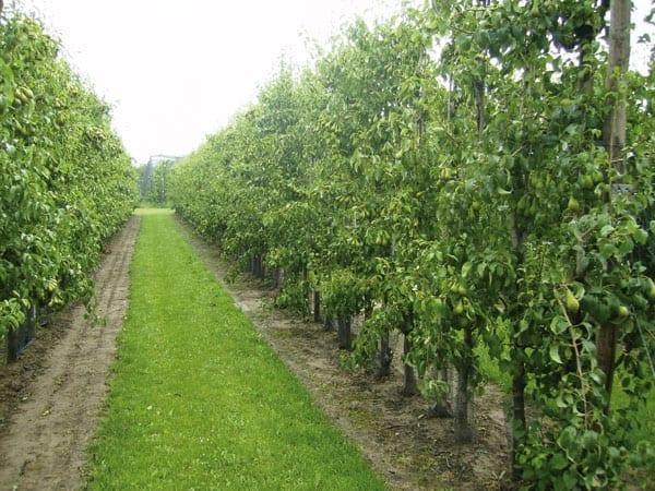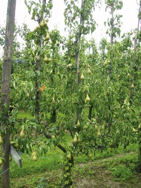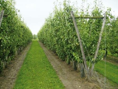Korony sznurowe (fot. 4) stosowane w bardzo intensywnych nasadzeniach (nawet co 40 cm w rzędzie) nie mają wieloletnich gałęzi bocznych, a jedynie długopędy zakończone pąkiem kwiatowym.