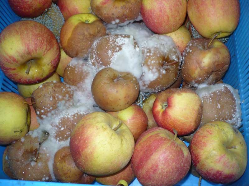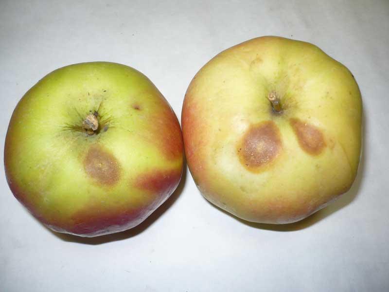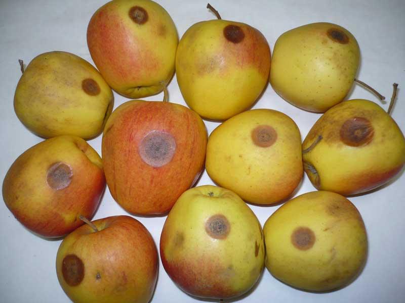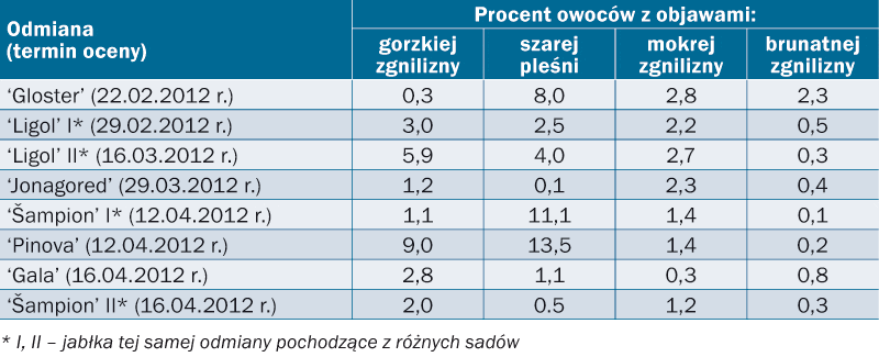 Jak zwykle nasilenie brunatnej zgnilizny jabłek (Monilinia fructigena) było bardzo małe (tab. 1). Od wielu już lat przechowalnicza forma tej choroby nie powoduje dużych strat w chłodniach (do 2%). Przy bardzo długim przechowywaniu może następować zakażenie jabłek sąsiednich przez kontakt, podobnie jak to ma miejsce na drzewie. Jednak gniazda brunatnej zgnilizny są małe, obejmują najczęściej 2, 3 jabłka połączone ze sobą. Ponadto nawet całkowicie zgniłe jabłka są jędrne, suche i nie zanieczyszczają innych owoców. Kolejna choroba przechowalnicza – mokra zgnilizna jabłek (Penicillium expansum) – również nie powodowała dużych strat i występowała najczęściej na owocach uszkodzonych w czasie zbioru. Tylko świeże przecięcia skórki są podatne na zakażenie, natomiast jabłka uszkodzone przez szkodniki wcześniej w sezonie mają już zaschnięte rany i nie są podatne na zakażenie przez Penicillium. Ilość jabłek z objawami mokrej zgnilizny zwiększała się po ich przetrzymaniu w temperaturze pokojowej.
