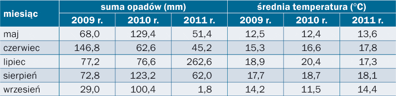 Przyczyną takiego stanu rzeczy była pogoda panująca w miesiącach przedzbiorczych w 2011 r. W Polsce centralnej (Dąbrowice) w sierpniu było 2 razy mniej opadów, a we wrześniu aż ponad 50 razy mniej niż w 2010 r. (tab. 2). Ostatni większy opad (13 mm) wystąpił 14 sierpnia i od tej pory aż do zbiorów praktycznie panowała susza. Wiadomo, że zarodniki grzybów Pezicula spp. tworzą się na pędach jabłoni w drugiej połowie lata i zakażają dojrzewające jabłka. Do tworzenia się zarodników Pezicula spp. potrzebna jest bardzo wysoka wilgotność powietrza, natomiast krople deszczu przenoszą zarodniki na jabłka. Następuje to w okresie 1–1,5 miesiąca przed zbiorem jabłek. Bardzo mała ilość deszczu i wysoka temperatura powietrza w tym czasie w 2011 r. nie sprzyjały zakażeniu jabłek.