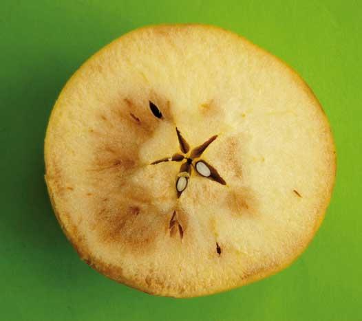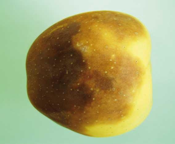 Rozpad starczy związany jest z przejrzewaniem owoców. Najszybciej pojawia się na owocach, których dojrzałość w momencie zbioru zdecydowanie odbiegała od optymalnej. Charakterystycznymi objawami rozpadu są zbrązowienia miąższu, który staje się suchy i kaszowaty (fot. 1). Bardzo często zmianom w miąższu towarzyszą przebarwienia skórki (fot. 2). Opóźnione schładzanie jabłek po zbiorze i przechowywanie ich w wyższej niż optymalna temperaturze sprzyja przyspieszeniu pojawienia się pierwszych symptomów choroby. Zdecydowanie najszybciej pojawiają się one w przechowalni, nieco później w chłodni NA, a najpóźniej w KA. Czynnikami opóźniającymi procesy starzenia poza temperaturą są: niskie stężenie tlenu, podwyższone stężenie dwutlenku węgla, i 1-MCP (w Polsce dopuszczony do stosowania w przechowalnictwie jabłek preparat SmartFresh). Pierwsze kontrole owoców w tym sezonie przechowalniczym wskazują, że rozpady starcze to bardzo istotny problem. Wydaje się, że bieżący sezon będzie dobrą weryfikacją przestrzegania zaleceń technologicznych. Dotyczy to zarówno traktowania pozbiorczego jabłek jak również zastosowania nowoczesnych technologii przechowalniczych. Jak wspomniałem na wstępie po wyprodukowaniu owoców wysokiej jakości dla osiągnięcia sukcesu przechowalniczego konieczne jest przestrzeganie określonych reguł związanych chociażby z ustalaniem dojrzałości zbiorczej owoców trafiających do obiektów. Niepokój budzi fakt, że nawet w tych najnowocześniejszych obiektach zagadnienia optymalizacji terminu zbioru traktuje się po „macoszemu”. Niestety wiele wskazuje, że w tym sezonie zbierze to swoje żniwa przy wyjmowaniu owoców do handlu.