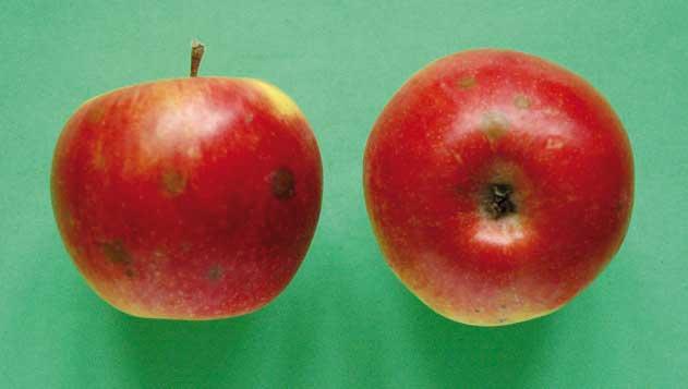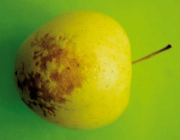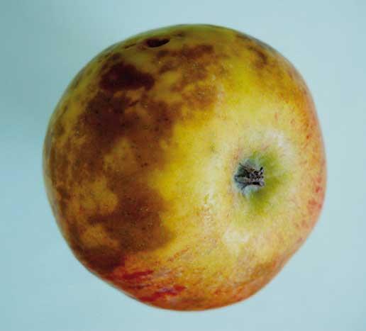 Oparzelizna powierzchniowa to choroba, której charakterystyczne objawy (fot. 4) pojawiają się przy nadmiernym wydłużaniu okresu przechowywania. Podatność owoców na tę chorobę jest ściśle powiązane z odmianą, warunkami sezonu wegetacyjnego i terminem zbioru. Owoce zebrane przed osiągnięciem optymalnej dojrzałości, opóźnione ich schłodzenie, przechowywane w zbyt wysokiej wilgotności względnej powietrza i przy złej cyrkulacji powietrza w komorze to czynniki stymulujące powstanie choroby. Ciepła i sucha pogoda podczas wegetacji i niska zawartość wapnia w owocach również zwiększają podatność owoców na oparzeliznę powierzchniową. Brak chemicznych metod zapobiegania chorobie powoduje, że w niektórych sezonach straty z nią związane są bardzo dotkliwe. Nowoczesne technologie z bardzo niskim stężeniem tlenu w atmosferze, jak również pozbiorcze traktowanie jabłek preparatem SmartFresh istotnie ogranicza występowanie choroby, ale jej w pełni nie eliminuje. Kontrola owoców podczas przechowywania to jedyny, praktyczny sposób na zminimalizowanie strat.