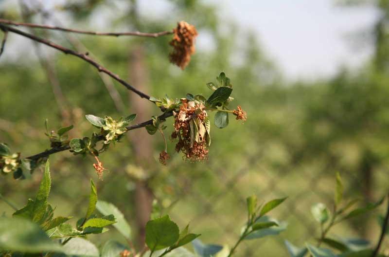 Na liściach powstają najczęściej okrągłe, początkowo żółtawe, później brunatne plamki. Ich cechą charakterystyczną jest jasna obwódka (fot. 5). W sprzyjających warunkach pogodowych plamy mogą zlewać się ze sobą, a tkanki w ich obrębie ulegają nekrozie. Zaschnięte tkanki wykruszają się i powstają charakterystyczne dziurki w blaszkach liściowych (fot. 6). Bakteria może porażać także zawiązki owoców, na których powstają wodniste, tłustawe, ciemnozielone plamy, z czasem czerniejące i zasychające. Porażone zawiązki zasychają i pozostają przez pewien czas na drzewach. W przypadku wiśni i czereśni możemy mieć także do czynienia z infekcjami zimujących pąków, które ulegają nekrozie i zamierają. Porażone pąki na przedwiośniu nabrzmiewają, ale nie rozwijają się, zamierają i pozostają zaschnięte na pędach.