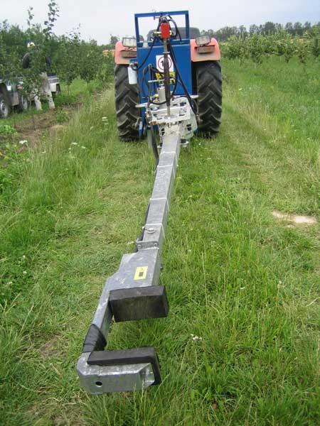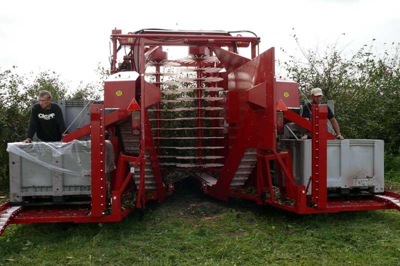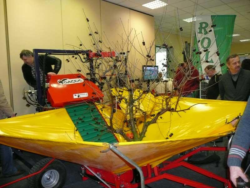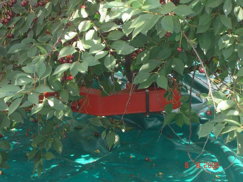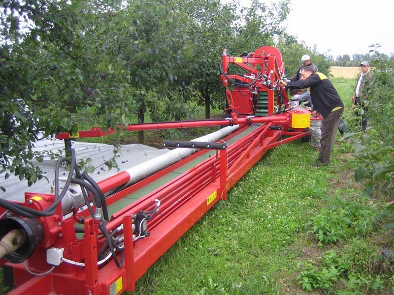 Urządzenia pracujące cyklicznie ogólnie można nazwać otrząsarkami (fot. 1). Ze względu na prostą konstrukcję i wysoką efektywność pracy (w porównaniu do zbioru ręcznego) są one najbardziej rozpowszechnione w polskich sadach. Zasada pracy urządzeń tego typu polega na chwytaniu pnia drzewa na wysokości około 60 cm za pomocą ruchomego ramienia z zainstalowanym mechanizmem wywołującym drgania. Dzięki temu, po zaciśnięciu uchwytu na pniu i włączeniu urządzenia, drgania rozchodzą się po całym drzewie. Wówczas pod wpływem odpowiednio dobranej amplitudy drgań owoce odrywają się od szypułek i opadają na ziemię. W celu ułatwienia zbioru pod koroną zazwyczaj rozkłada się plandekę (fot. 2). Urządzenia tego typu są zawieszane na trzypunktowym układzie zawieszenia ciągnika. Niektórzy producenci mają w ofercie zaczepiane do ciągnika agregaty otrząsająco-oczyszczające. Mają one, oprócz wcześniej wspomnianego mechanizmu otrząsającego, ekrany zbierające, które są rozkładane indywidualnie pod każde drzewo (fot. 3). Po opadnięciu owoców, ekran jest automatycznie zwijany i owoce trafiają na przenośnik taśmowy (fot. 4). W końcowym etapie transportu zanieczyszczenia (np. liście czy niewielkie fragmenty gałązek) są odwiewane i czyste owoce trafiają do pojemników. Cykl pracy otrząsarki jest krótki i wynosi średnio poniżej 1,5 minuty na drzewo.