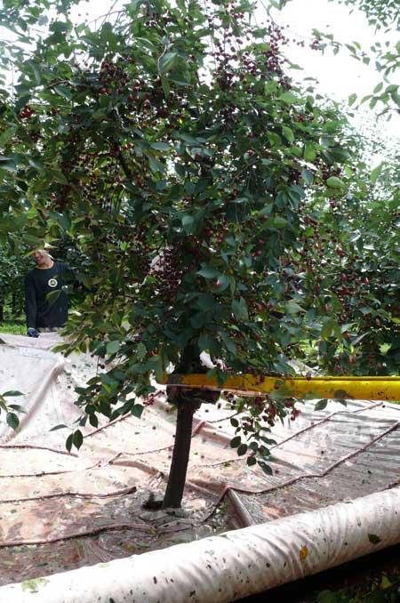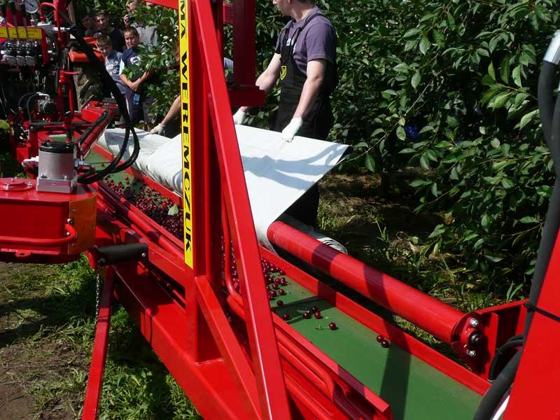 Znacznie mniej rozpowszechniony jest zbiór owoców wiśni w ruchu ciągłym. W Polsce prace nad tą technologią trwają od około 20 lat, jednak wysoka cena zakupu, rozdrobnione plantacje i niedostosowany pokrój drzew sprawiają, że maszyny tego typu wciąż są rzadkim widokiem w naszych sadach. Zbiór tą metodą polega na najeżdżaniu kombajnem na cały rząd drzew (fot. 5). Wówczas po obu stronach korony będą znajdować się głowice otrząsające z wystającymi prostopadle do osi drzewa sprężystymi prętami. Mechanizm wprawiony w drgania o odpowiednio dobranej częstotliwości powoduje strząsanie owoców. Następnie trafiają one na usytuowane w dolnej części maszyny transportery odbierające i przenoszące je w kierunku pojemników (fot. 6). Zanieczyszczenia są usuwane w końcowej fazie transportu. Wydajność pracy kombajnu dochodzi do 0,4 ha/godz. Kombajny mogą być zaczepiane lub samojezdne.