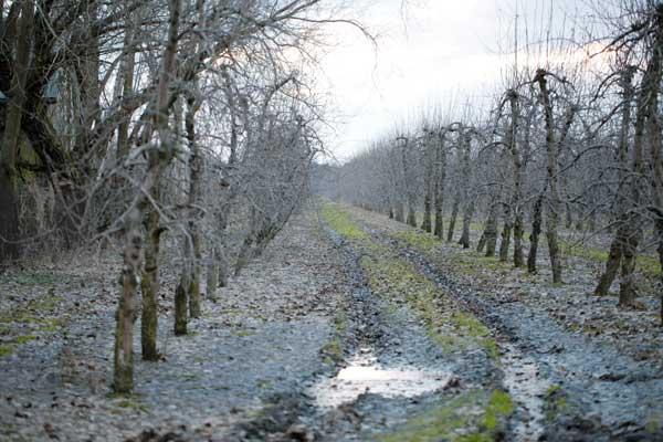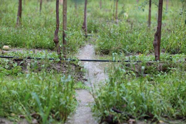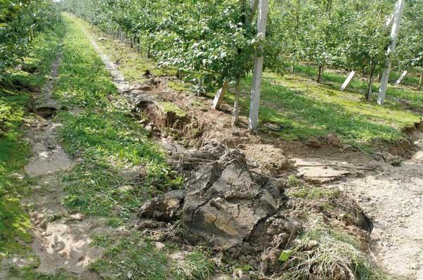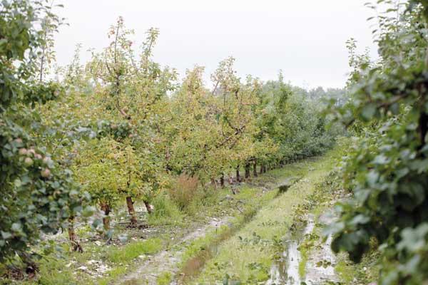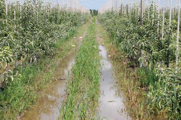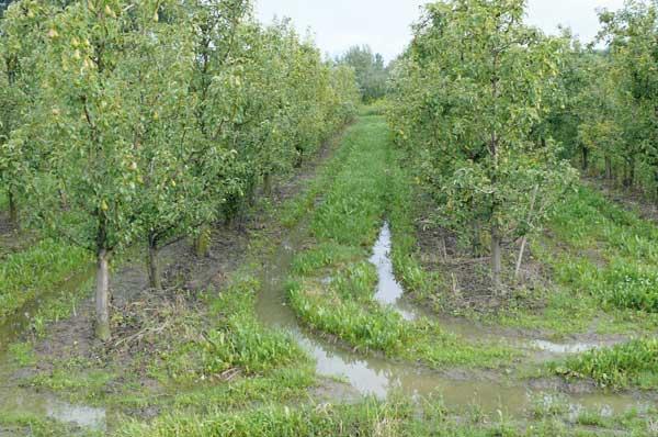 Nadmierne uwilgotnienie gleby wiąże się również z problemami natury „technicznej” – utrudnieniem wjazdu opryskiwaczami, tonięciem ciągników, koleinami i w konsekwencji zagęszczaniem profilu glebowego (fot. 6), co także ma znaczenie dla dostępności składników. Przy dużej liczbie przejazdów traktorem zagregatowanym z opryskiwaczem stopień zagęszczenia powierzchniowych warstw gleby jest ogromny już przy normalnej pogodzie. Jeżeli do tego dołączy się jeszcze duża ilość wody, powodującą rozmiękczenie gleby, proces ten zachodzi dużo szybciej i intensywniej. Jego efektem jest zaburzenie stosunków wodno-powietrznych gleby w sadzie, prowadzące do dysfunkcji systemu korzeniowego oraz zmian właściwości fizykochemicznych gleby, zwłaszcza równowagi procesów utleniania i redukcji.