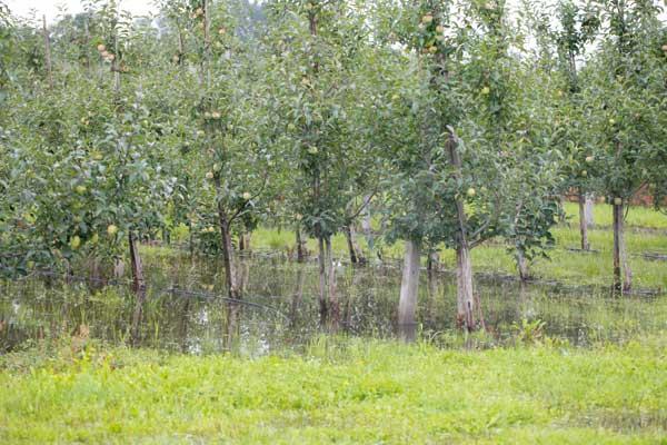 Także ubiegłoroczna wiosna i lato dostarczyły nam sporo emocji. Z początkiem maja przyszło ochłodzenie i w wielu rejonach sadowniczych wystąpiły silne lub bardzo silne przymrozki. Miejscami (np. na Kujawach) temperatura przy gruncie spadła nawet do -10oC. Obronną ręką wyszli sadownicy z rejonu Białej Rawskiej, Grójca, Warki, Lublina i Sandomierza oraz Nowego Sącza. W tych rejonach, przy tak niskiej temperaturze, padający deszcz ze śniegiem lub deszcz ochroniły kwiaty i pąki kwiatowe przed zmarznięciem. Lipiec 2011 r. był bardzo wilgotny (fot. 3). W tym miesiącu i w pierwszej połowie sierpnia spadło ponad 300 mm deszczu, co także nie pozostało obojętne dla drzew. Wiele wskazuje na to, że w nadchodzących latach będziemy mieli coraz częściej do czynienia z gwałtownymi zjawiskami atmosferycznymi i nieprzewidywalnymi zmianami pogody. Perspektywa ulewnych deszczów, silnych ochłodzeń czy fal upałów powinna skłonić nas do modyfikowania nawożenia w sadach.