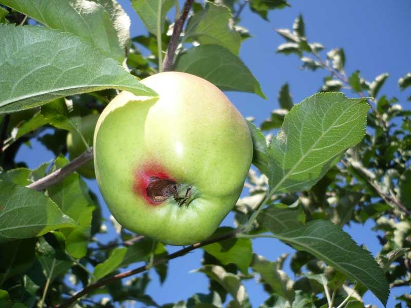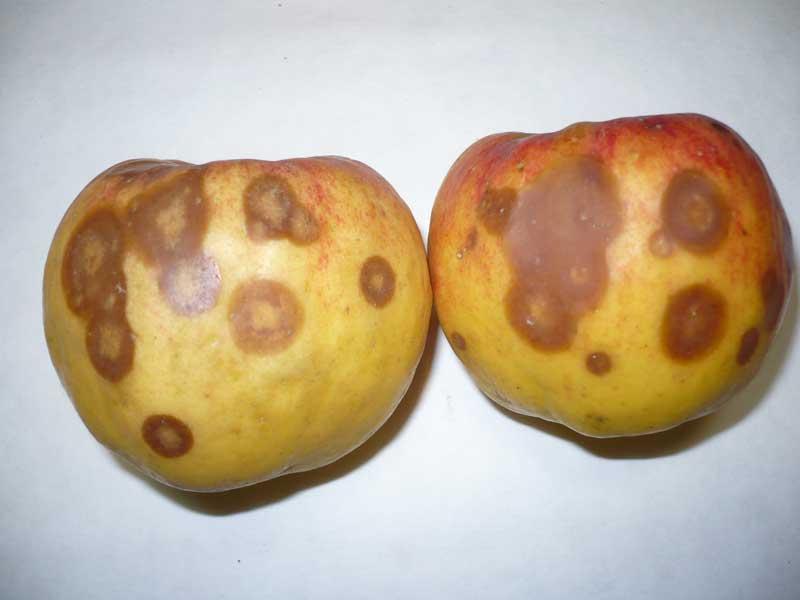 Gorzka zgnilizna jabłek jest największym zagrożeniem dla tych owoców w ostatnich latach. Dotychczas za głównych sprawców tej choroby uważane były dwa grzyby: Pezicula alba i P. malicorticis. Glomerella cingulata to kolejny grzyb, którego znaczenie jako współsprawcy tej choroby wzrosło w ciągu ostatnich dwóch lat. Do infekcji tymi patogenami dochodzi jeszcze podczas wzrostu owoców w sadzie, a drogą wnikania mikroorganizmów są przetchlinki na skórce jabłek. Źródłem zarodników konidialnych grzybów są zgorzele znajdujące się na korze porażonych drzew. Dodatkowo nasileniu choroby sprzyja wilgotna i deszczowa pogoda w ciągu sezonu wegetacyjnego, a szczególnie przed zbiorem owoców. Na jabłkach będących w fazie dojrzałości konsumpcyjnej pojawiają się początkowo niewielkie plamki gnilne, potocznie zwane „oczkami”, które z czasem powiększają swoją średnicę. Miąższ pod skórką zapada się i brunatnieje (fot. 1). Takich plam na owocu może być kilka, które w miarę postępowania procesu chorobotwórczego zaczynają się ze sobą łączyć. Miąższ wokół chorobowo zmienionych części owoców jest gorzki w smaku, stąd nazwa choroby. Warunki niskiej temperatury i modyfikowanej atmosfery nie powstrzymują rozwoju choroby.