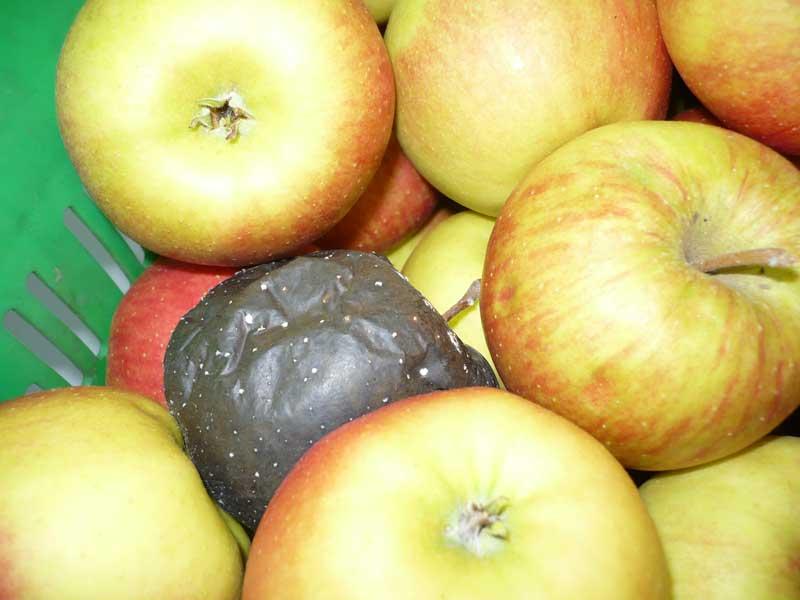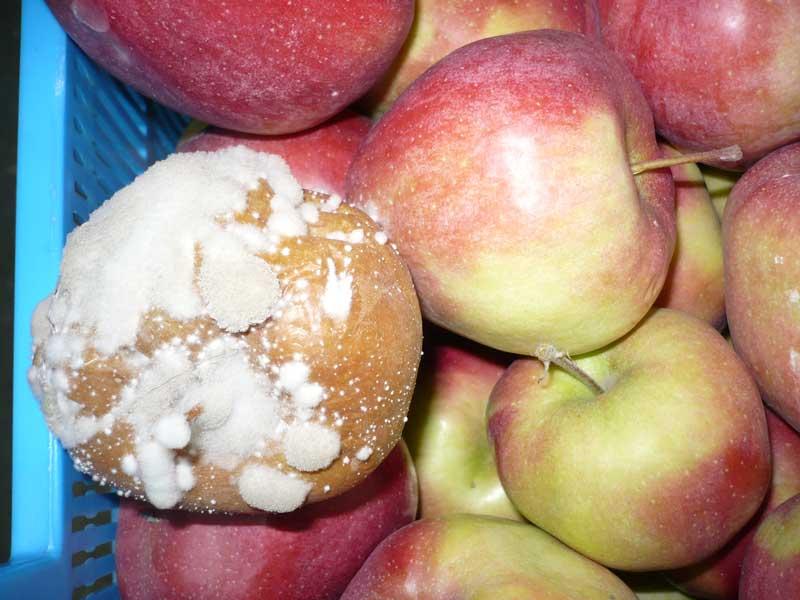 Mokra zgnilizna. Owoce z ranami skórki powstałymi np. podczas gradobicia bądź w wyniku żerowania szkodników, są bardziej niż zdrowe narażone na atak patogenów w okresie przechowywania owoców. Jedną z częstszych chorób rozwijających się w miejscu uszkodzenia skórki jest mokra zgnilizna powodowana przez grzyby z rodzaju Penicillium (najczęściej jest to gatunek P. expansum). Miąższ w miejscu wnikania grzyba staje się miękki i wodnisty, dodatkowo wydziela się nieprzyjemny zapach. Gnilne plamy na owocach pokrywają się białymi i zielonymi pylącymi skupieniami zarodnikującej grzybni (fot. 4). Źródłem patogenu są skażone nim gleba oraz drewniane skrzynki i palety znajdujące się w przechowalniach.