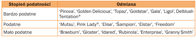 Według dr Hanny Bryk z Instytutu Ogrodnictwa w Skierniewicach, program ochrony przed chorobami przechowalniczymi najlepiej zaplanować na podstawie wyników lustracji owoców wyjmowanych z przechowalni w poprzednim sezonie. W zależności od nasilenia poszczególnych chorób, dobiera się odpowiednie fungicydy. Z prowadzonych w IO badań wynika, iż najczęściej występującymi w ostatnich latach chorobami przechowywanych jabłek są: gorzka zgnilizna jabłek (80% wszystkich chorób), szara pleśń (12%), mokra zgnilizna (4,7%) oraz brunatna zgnilizna jabłek (3,2%). Stopień porażenia owoców przez patogeny jest uzależniony od odmiany. Na przykład zimowa odmiana ‘Ligol’ jest bardzo podatna na gorzką zgniliznę jabłek i szarą pleśń, ‘Gloster’ natomiast charakteryzuje się dużą podatnością na szarą pleśń, ale małą na gorzką zgniliznę jabłek (tabela).