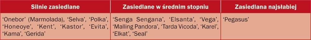 Oba szkodniki spędzają sen z powiek wielu uprawiającym rośliny jagodowe. Jak informowała dr hab. Barbara Łabanowska, prof. nadzw. IO w Skierniewicach, w reprezentowanej przez nią placówce naukowej trwają wzmożone badania nad rozwiązaniem problemów związanych z tymi szkodnikami. Do zagadnienia podchodzi się tam kompleksowo i pracują nad nim naukowcy z różnych zakładów – począwszy od kreujących nowe odmiany, poprzez nawożeniowców (pozytywnie na ograniczenie zasiedlania krzewów porzeczek przez wielkopąkowca działają nawozy siarkowe użyte przed kwitnieniem), na ochronie roślin kończąc. Brana jest także pod uwagę technika ochrony. Badana jest skuteczność różnych, już zarejestrowanych w Polsce środków, niestety używanych do innych celów. Profesor zachęcała więc konsorcja chemiczne do rejestracji zoocydów w uprawach małoobszarowych, a grupy producentów rolnych do podejmowania prób rozszerzania rejestracji środków na zasadach off label (pozaetykietowych). Pracownicy IO udostępnią z chęcią wyniki swoich badań i pomogą, w ramach możliwości, w tym procesie – przekonywała. Niezmiernie ważna w przypadku obu rodzajów roślin jest integracja metod uwzględniająca odpowiednie stanowisko pod plantację, a także dobór odmian. Przygotowywana jest do wdrożenia odporna na wielkopąkowca porzeczkowego odmiana ‘Polares’. Dysponujemy już średnio podatnymi, do których zalicza się między innymi ‘Ores’, ‘Ruben’, ‘Tines’, ‘Tiben’. Uważana za odporną ‘Ben Hope’ niestety prawdopodobnie „przełamała odporność”, docierają bowiem częste sygnały do IO o zasiedleniu jej przez wielkopąkowca. Wśród odmian truskawek prof. B. Łabanowska wskazała trzy grupy o odmiennym poziomie zasiedlenia (preferencjach) przez roztocza truskawkowca (tabela).
