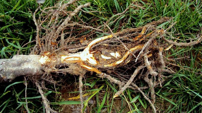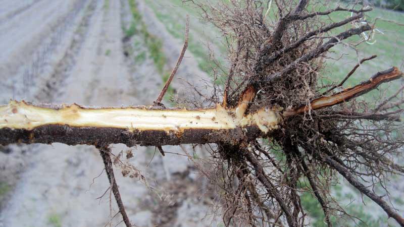 System korzeniowy drzew owocowych jest znacznie wrażliwszy na mróz niż część nadziemna. Drzewa czereśni giną, gdy temperatura gleby obniży się do około -12 lub -11ºC. Dla antypki temperatura graniczna wynosi poniżej -15ºC, a dla podkładek wegetatywnych jabłoni -10ºC. Prawdopodobieństwo uszkodzeń korzeni byłoby mniejsze, gdyby na polach zalegała nawet niezbyt gruba okrywa śnieżna. Śnieg jest doskonałym izolatorem (warstwa o grubości ok. 1 cm ma podobne właściwości izolacyjne jak 10-centymetrowa warstwa gleby). Szkodliwość niskiej temperatury zależy też od szybkości jej obniżania się i okresu utrzymywania się tego stanu. Minionej zimy temperatura obniżała się w ciągu kilku dni i utrzymywała bez zmian przez około 3 tygodnie. Uszkodzenia mrozowe korzeni uważane są za najgroźniejsze dla drzew owocowych i roślin jagodowych. Zdrowe tkanki korzeni są białe, uszkodzone są mlecznokawowe do prawie czarnych (fot. 6) i często z wyczuwalnym zapachem butwiejącego i spleśniałego drewna. Często uszkadzane są również tkanki szyjki korzeniowej lub wstawki skarlającej.