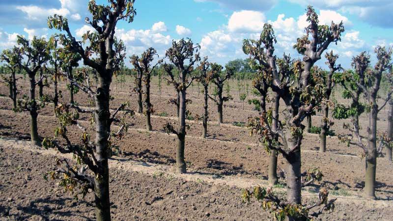 Niektórzy sadownicy zaczęli analizować wykonywane wcześniej zabiegi w sadzie, przypisując sobie popełnienie jakiegoś błędu w aplikacji środków ochrony roślin lub nawozów dolistnych. Proces zamierania drzew rozpoczęty na początku maja trwał mimo ochłodzenia w połowie miesiąca, ale był już wolniejszy. W wielu sadach obserwowano placowe zamieranie drzew (fot. 1), w innych wyraźne różnice odmianowe (np. rzędy drzew różniące się od pozostałych – fot. 2), a w niektórych jedynie pojedyncze zamierające drzewa (fot. 3). Przyczyną było przede wszystkim uszkodzenie systemu korzeniowego drzew zimą, które spowodowało utrudnienie w pobieraniu i przewodzeniu wody i składników pokarmowych w okresie kwitnienia, gdy zapotrzebowanie na nie było największe.