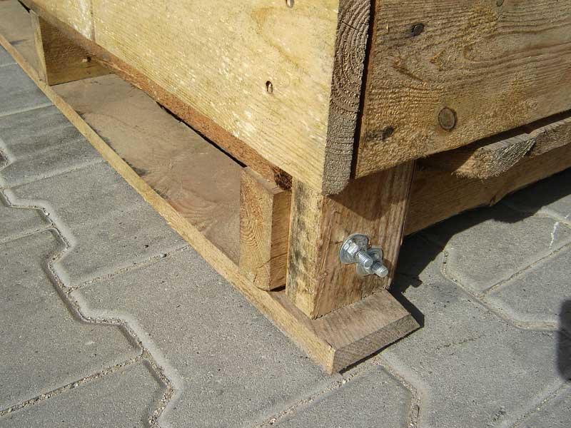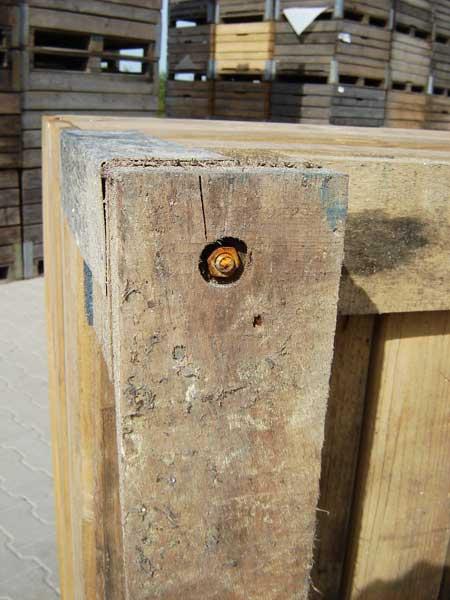 Elementem wpływającym na bezproblemowe wieloletnie użytkowanie skrzyniopalety jest jakość jej wykonania. Tam, gdzie wymagana jest duża wytrzymałość połączeń (szczególnie części nośnej ze skrzynią), elementy powinny być ze sobą skręcone (fot. 4). Dodatkowo w takich newralgicznych punktach, w celu zwiększenia stabilności, montuje się metalowe okucia, a połączenia wykonuje za pomocą gwoździ pierścieniowych (fot. 5). Deski ze słupkami łączy się także za pomocą gwoździ. Niektórzy producenci proponują dodatkowo klejenie desek do słupków narożnych, szczególnie gdy planowane jest wysokie składowanie. Taki zabieg ma zwiększyć stabilność skrzyniopalet.