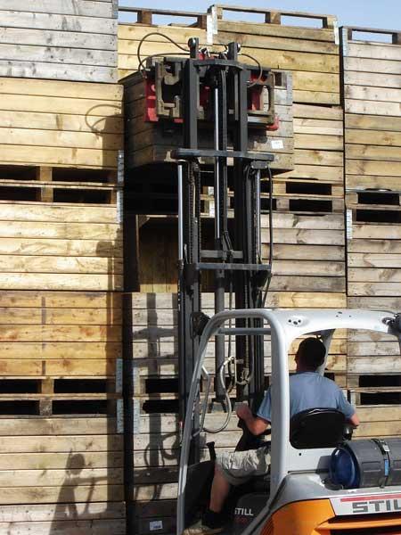 Kolejnym parametrem, być może najważniejszym, na który należy zwrócić uwagę są wymiary skrzyniopalet. Najczęściej spotykane są skrzynie o długości 1,2 m, szerokości 1 m i wysokości 0,8 m. Prawie każdy producent deklaruje jednak możliwość zmiany tych wymiarów według wymagań odbiorcy. Ma to szczególne znaczenie, gdy po ustawieniu skrzyniopalet jedna na drugiej (w słupku) w komorze, nad ostatnią pozostaje tylko niewielki odstęp do stropu. Dokładnie wypełniona komora uniemożliwi bowiem prawidłową cyrkulację powietrza. Z tego względu przed zakupem warto zmierzyć wysokość pomieszczenia, w którym będą składowane owoce i dobrać wymiar skrzyniopalet. Ich wymiary zewnętrzne są także istotne, gdyż puste skrzyniopalety o standardowych wymiarach można transportować i składować w tzw. trójkach (fot. 6), przez co lepiej wykorzystuje się przestrzeń. Nieprzemyślana zmiana jednego z wymiarów może taką możliwość składowania wykluczyć.