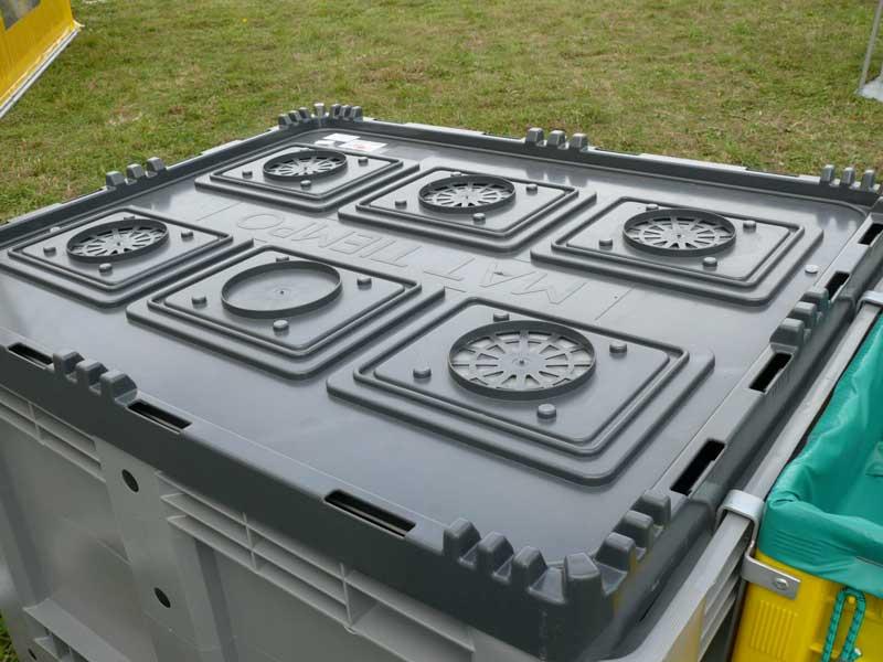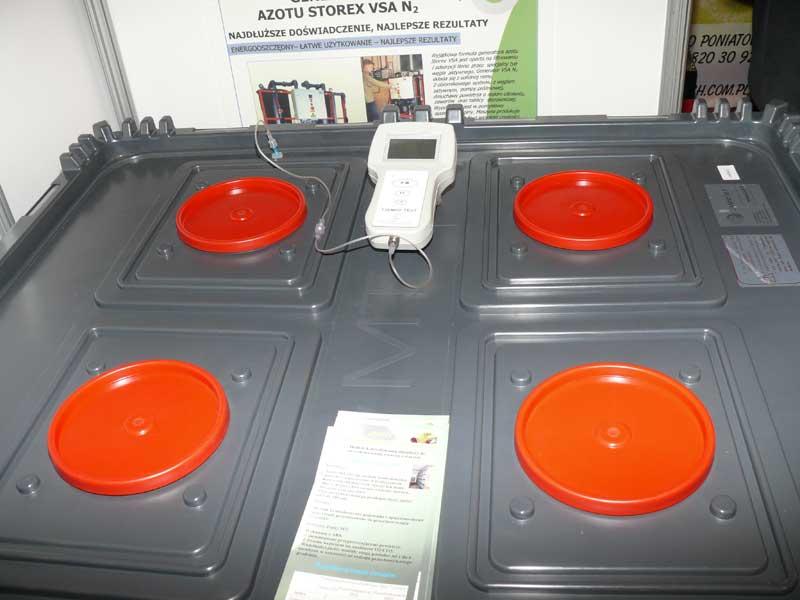 Skrzyniopalety z tworzywa sztucznego można wyposażyć w pokrywy (fot. 8) które umożliwiają modyfikację składu gazowego atmosfery we wnętrzu pojemnika dzięki zastosowaniu specjalnych membran (fot. 9) pozwalających na dyfuzję gazów. Warunkiem prawidłowego przechowywania jest odpowiednio szybkie schłodzenie zebranych owoców i założenie pokrywy. Po kilku dniach, zależnie od przetrzymywanego gatunku, należy skontrolować stężenie O2 i CO2. Jest to rozwiązanie szczególnie przydatne do krótkotrwałego przechowywania owoców miękkich, ale także spotykane w przypadku przechowywania owoców ziarnkowych.