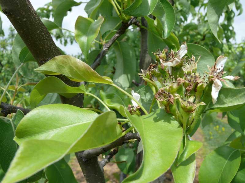 Piotr Lubaszka (fot. 2) i Łukasz Kutermach (fot. 3) przedstawili produkty firmy Intermag i omówili zalecenia dotyczące nawożenia śliw i grusz w okresie wzrostu zawiązków owocowych. W czasie opadania płatków kwiatowych na śliwach zalecali nawożenie borem (Bormax), równocześnie z użyciem produktów: Fostar®, Tytanit® i Silvit®. Fosfor jest niezbędny w początkowym okresie wzrostu zawiązków owocowych, ponieważ bierze udział w podziałach komórkowych w zapłodnionych zalążniach. Często jednak w tym czasie jest zbyt chłodno, aby rośliny mogły pobrać ten składnik z gleby (fot. 4), dlatego dobrze jest podać go roślinom dolistnie. Tytanit® jest produktem, który nie tylko wzmacnia odporność roślin na niekorzystne warunki środowiska, ale również korzystnie oddziałuje na proces zapłodnienia. Silvit® zawiera krzem w formie organicznej, który poprzez wnikanie do ścian komórkowych wzmacnia je i sprawia, że stają się one barierą trudną do przebycia przez czynniki chorobotwórcze i szkodniki.