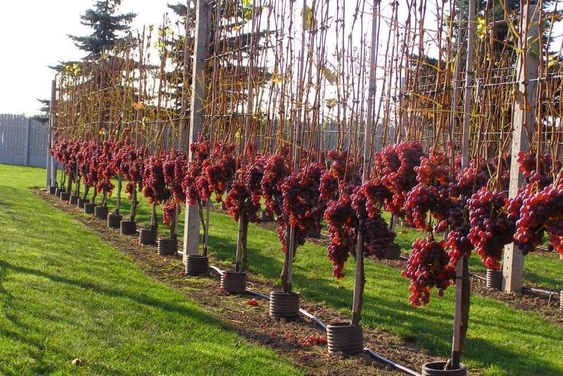 Rozstawę należy dostosować do formy prowadzenia krzewów. W Polsce, dla odmian o umiarkowanym wzroście i średniej odporności na przemarzanie najczęściej stosowane są formy jednoramienne (Guyota i Casenave’a), na pniu o średniej wysokości (ok. 70 cm) i całkowitej wysokości rusztowania 175 cm (fot. 5). Przy tym sposobie krzewy sadzi się w rzędach co 1 m, zachowując odstępy między rzędami 2–2,5 m. Odmiany silnie rosnące, szczególnie gdy są uprawiane na glebach żyznych i wilgotnych, powinny być sadzone rzadziej i prowadzone w wyższych, bardziej przestrzennych formach. Odmiany rosnące słabiej, uprawiane na glebach suchych i ubogich w składniki pokarmowe, należy sadzić gęściej i prowadzić niżej.