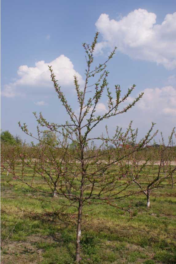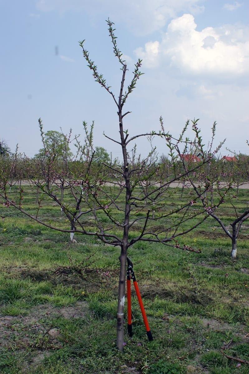 Ten gatunek jest znany z dużej wrażliwości drewna i pąków kwiatowych na niską temperaturę. Średnio co kilka lat pąki kwiatowe oraz wierzchołki pędów jednorocznych brzoskwini przemarzają, natomiast starsze drewno (podstawy gałęzi i konarów oraz pień) ulega podobnym uszkodzeniom bardzo rzadko. W bezśnieżne zimy mogą natomiast podmarzać korzenie drzew. O skali uszkodzeń może zdecydować, oprócz warunków pogody, także stan zdrowotny drzewa i jego kondycja. Ze względu na silny wzrost brzoskwinia tworzy duże korony z licznymi pędami i gałęziami. Z natury drzewa przyjmują pokrój krzaczasty, ale stosunkowo łatwo poddają się zabiegom formującym. W zależności od potrzeby można je prowadzić w formie korony przewodnikowej albo otwartej, swobodnej. W formie krzaczastej prowadzi się drzewa nasienne. Różnice w budowie między koroną przewodnikową a swobodną są zasadnicze, co pociąga za sobą konieczność różnego podejścia do ich cięcia. Jednak niezależnie od formy korony głównym celem tego zabiegu (fot. 1, 2) jest usunięcie gałęzi i pędów słabych, zasychających i martwych. Cięcie takie nazywamy „sanitarnym”. Ma ono zasadnicze znaczenie dla zdrowia drzew, gdyż usuwa potencjalne źródła zakażenia grzybami i bakteriami chorobotwórczymi. Ponadto należy usunąć gałęzie i pędy, które są wyraźnie silniejsze (grubsze) od wyrastających obok nich. W koronie drzewa powinny pozostać tylko wyrównane pędy i gałęzie, które nie mogą wyrastać po 2 lub 3 z jednego miejsca albo z pnia pod ostrym kątem. W ostrych kątach rozgałęzień konarów bardzo często rozwijają się zrakowacenia i dlatego rosnące w ten sposób gałęzie trzeba wyciąć na gładko, bez pozostawienia czopów, gdyż może je zasiedlić bakteria Pseudomonas syringae, sprawca raka bakteryjnego.