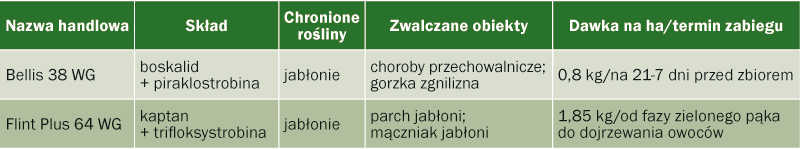 Na liście fungicydów (tabela 1) pojawiły się dwa nowe środki: Bellis 38 WG oraz Flint Plus 64 WG, oba to mieszaniny handlowe znanych polskim sadownikom substancji aktywnych, w łatwej i bezpiecznej w użyciu formie – granulatu. Umożliwią rotację i skuteczniejszą ochronę jabłoni i jabłek.