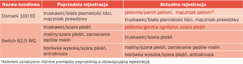 Ważnym uzupełnieniem „Programu…” jest rozszerzenie rejestracji (tab. 2) fungicydów Domark 100 EC (zwłaszcza w sytuacji, gdy zmalała liczba środków do walki z mączniakiem jabłoni) oraz Switch 62,5 WG (obecnie jedyny w Polsce fungicyd do ochrony jabłek przed szarą pleśnią).