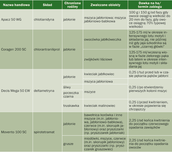 Zestawienie zoocydów (tab. 3) powiększyło się o środki Apacz 50 WG (granulat) oraz Coragen 200 SC (stężoną zawiesinę), także o zarejestrowane już po ukazaniu się „PORS na 2012” – Movento 100 SC (stężoną zawiesinę) oraz Decis Mega 50 EW (koncentrat do sporządzania emulsji wodnej). Trzy pierwsze zawierają nowe, dotychczas nieużywane w polskim sadownictwie substancje aktywne, wszystkie – mają formę gwarantującą bezpieczeństwo prawidłowo przygotowującym ciecz roboczą.