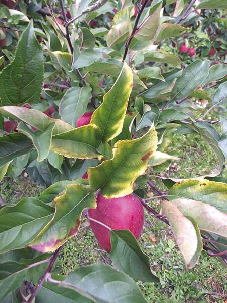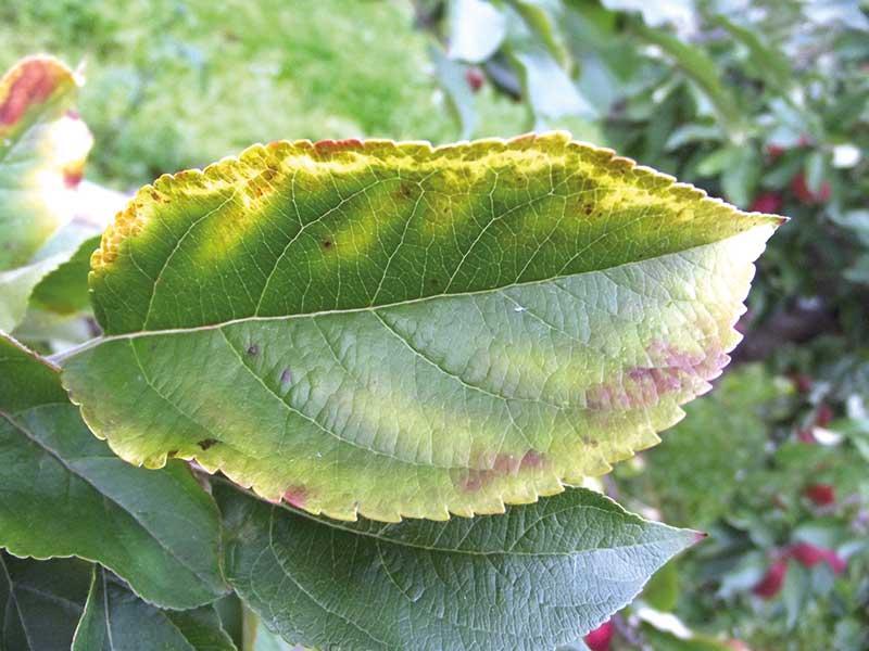 W okresach, w których rośliny nie mogą pobrać składników pokarmowych z gleby (np. susza, nadmiar wody, antagonizm i blokowanie pierwiastków, itp.), wymagają one pozakorzeniowego dokarmiania nawozami wieloskładnikowymi. Pomijając takie przypadki, w lipcu i sierpniu konieczne bywa także podawanie w ten sposób brakujących składników. Zadaniem sadownika jest niedopuszczenie do wystąpienia objawów niedoborów na roślinach, bo to oznacza, że niedożywienie trwa już jakiś czas, co nie będzie obojętne dla kondycji całego drzewa. Warto więc regularnie (co 2 lub 3 lata) wykonywać analizę gleby i korzystać z badania liści fluorymetrem. Z mojego doświadczenia wynika, że najczęściej brakuje liściom azotu i magnezu. W zadbanych sadach są to zazwyczaj niedobory chwilowe (wynikające z intensywnego wzrostu) i nieznaczne (niewpływające na intensywność fotosyntezy). W minionym sezonie, pomimo dobrego nawożenia, obserwowaliśmy często większe niedobory, zwłaszcza w pierwszej części sezonu, na drzewach z uszkodzonymi przez mróz korzeniami (fot. 2).