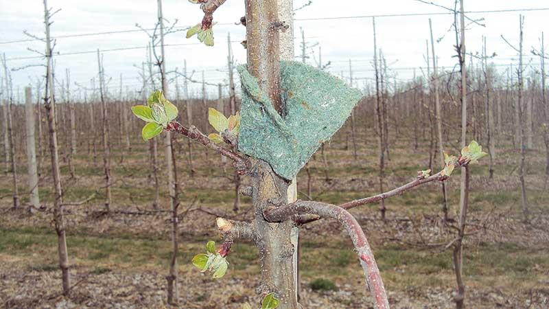 W sadach jabłoniowych poleca się 1500–3000 opasek na hektar, w zależności od wieku i wielkości drzew: w młodych i intensywnych sadach zaleca się powiesić 1 lub 2 opaski na co drugie drzewo (w kujawskich sadach stosowano niezbędne minimum, a więc jedną opaskę na co drugie drzewo), w starszych sadach wymagane są już 2 lub 3 opaski na drzewo, co podnosi koszty introdukcji. Opaski filcowe lub tkaniny z dobroczynkiem powinno się ściśle przywiązać do pnia lub bocznej gałęzi drzewa, aby powierzchnia styku opaski z korą drzewa była jak największa, co umożliwi roztoczom sprawne przejście z pasków na rośliny (fot. 3). Można też użyć zszywaczy do zamocowania opaski na pniu, lub – aby nie ranić drzewa –opaskę owinąć wokół bocznego konaru (najlepiej na wysokość około 1 m nad powierzchnią gleby) i zszywką spiąć naciągnięty filc, tak aby przylegał do tkanki drzewa. Drapieżcę można również wprowadzić na kilkadziesiąt drzew w środku kwatery, z nadzieją, że po 3–5 latach rozprzestrzeni się z wiatrem w całej kwaterze.