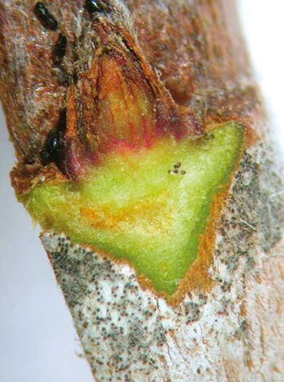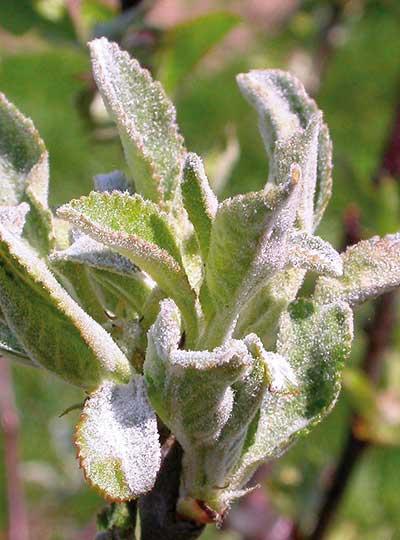 Z występowaniem mączniaka jabłoni wiąże się cykliczność zależna od warunków pogodowych zimą, a zwłaszcza dużych spadków temperatury. W lata następujące po takich zimach obserwujemy zwykle zmniejszoną liczbę objawów infekcji pierwotnych. Uważa się, że prawdopodobieństwo uszkodzenia przez mróz pędów zakażonych przez grzyb P. leucotricha jest większe, niż pędów niezakażonych oraz, że zimowe spadki temperatury do około –30°C (a w wyjątkowych warunkach nawet mniejsze) zabijają większość zainfekowanych pąków i zimującą w nich grzybnię (fot. 3). Tak było zimą w sezonie 2009/2010, kiedy w Polsce Centralnej pomiędzy 19 grudnia i 26 stycznia temperatura kilkakrotnie spadała poniżej –20°C, a największy jej spadek (–28°C) zanotowano 26 stycznia. Wówczas wiosną objawy infekcji pierwotnych spowodowanych przez mączniaka jabłoni obserwowano jedynie na odmianach bardzo podatnych.